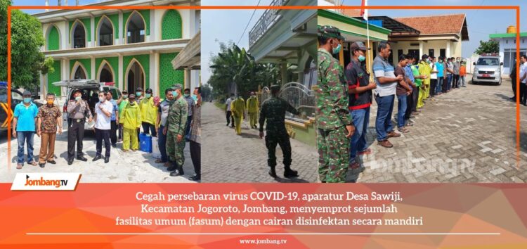 JOMBANG.TV- Cegah persebaran virus COVID-19, aparatur Desa Sawiji, Kecamatan Jogoroto, Jombang, menyemprot sejumlah fasilitas umum (fasum) dengan cairan disinfektan secara mandiri, pada hari Selasa (24/03) pagi.