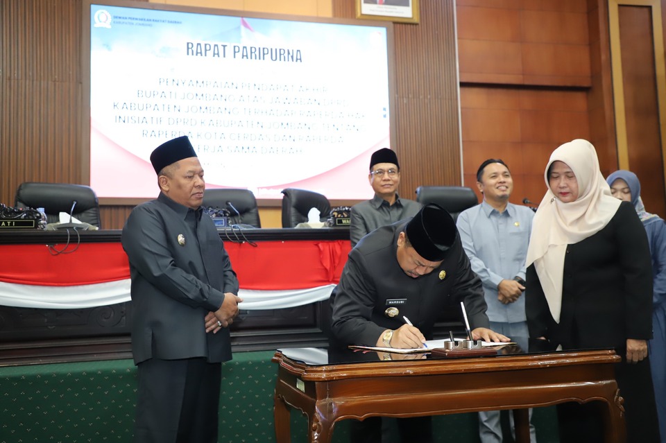 Pemerintah Kabupaten Jombang dan DPRD resmi menyetujui dua rancangan peraturan daerah (Ranperda) inisiatif, yaitu, Penyelenggaraan Kota Cerdas dan Kerja Sama Daerah. Dua payung hukum yang jika dijalankan serius, bisa jadi kunci arah pembangunan Jombang lima tahun ke depan.