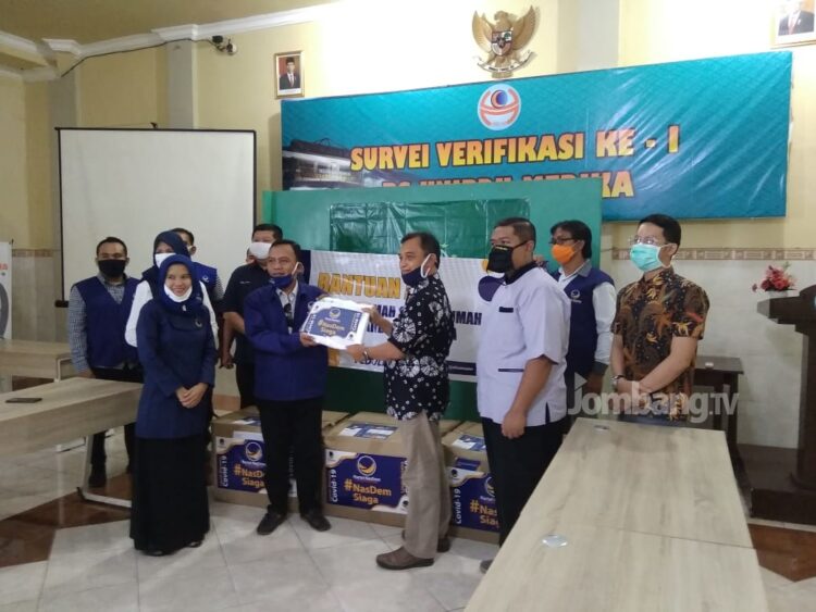 JOMBANG.TV, Peterongan – Dewan Pimpinan Wilayah (DPW) partai NasDem Jawa Timur, memberikan bantuan alat pelindung diri (APD) lengkap pada Asosiasi Rumah Sakit Nahdatul Ulama (ARSINU). Sedikitnya 150 APD lengkap diberikan oleh wakil ketua DPW NasDem, Niko Ainul Yaqin ke ketua ARSINU, Zulfikar As’ad, di Rumah Sakit UNIPDU Medika, Senin (4/5) siang.