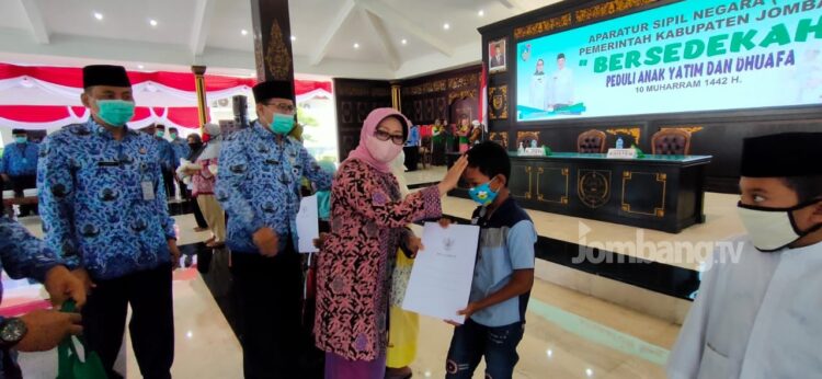 JOMBANG.TV – Bupati Jombang Hj. Mundjidah Wahab menyampaikan ucapan terima kasih dan apresiasi atas terlaksananya kegiatan sinergitas antara ASN Pemkab Jombang dan Badan Amil Zakat Nasional (Baznas) Kabupaten Jombang di 10 Muharram 1442 H (29/8/2020) ini, dalam agenda penyaluran sembako, alat tulis juga uang yang dikemas dalam agenda kebersamaan Aparatur Sipil Negara (ASN) Bersedekah Peduli Yatim dan Dhuafa.