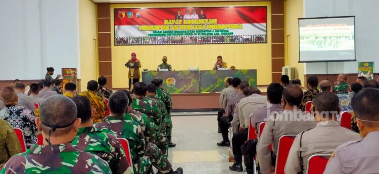JOMBANG.TV – Rapat Koordinasi (Rakor) Forkopimcam ( Danramil, Kapolsek, Camat) dari 21 Kecamatan di kabupaten Jombang bersama Forkopimda (Bupati, Dandim, Kapolres) Dalam Rangka Meningkatkan Sinergitas Dan Soliditas Penanganan Penyebaran Covid19 Diwilayah Kabupaten Jombang, dilaksanakan di Makodim 0814 Jombang pada, Selasa ( 23 Juni 2020) pagi.