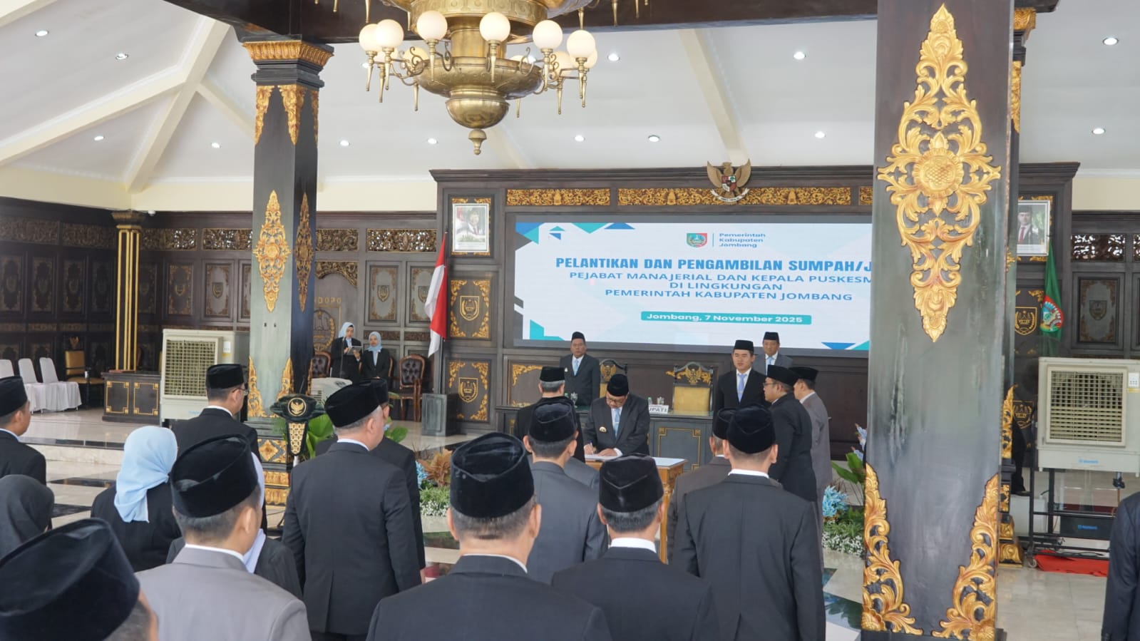 JOMBANG.TV – Pemerintah Kabupaten Jombang kembali melakukan rotasi dan pelantikan pejabat manajerial, administrator, pengawas, serta kepala puskesmas di lingkungan Pemkab Jombang, Jumat (7/11/2025).