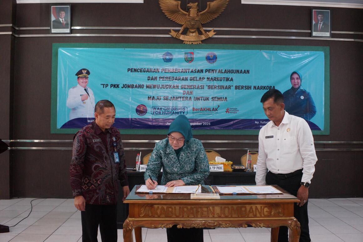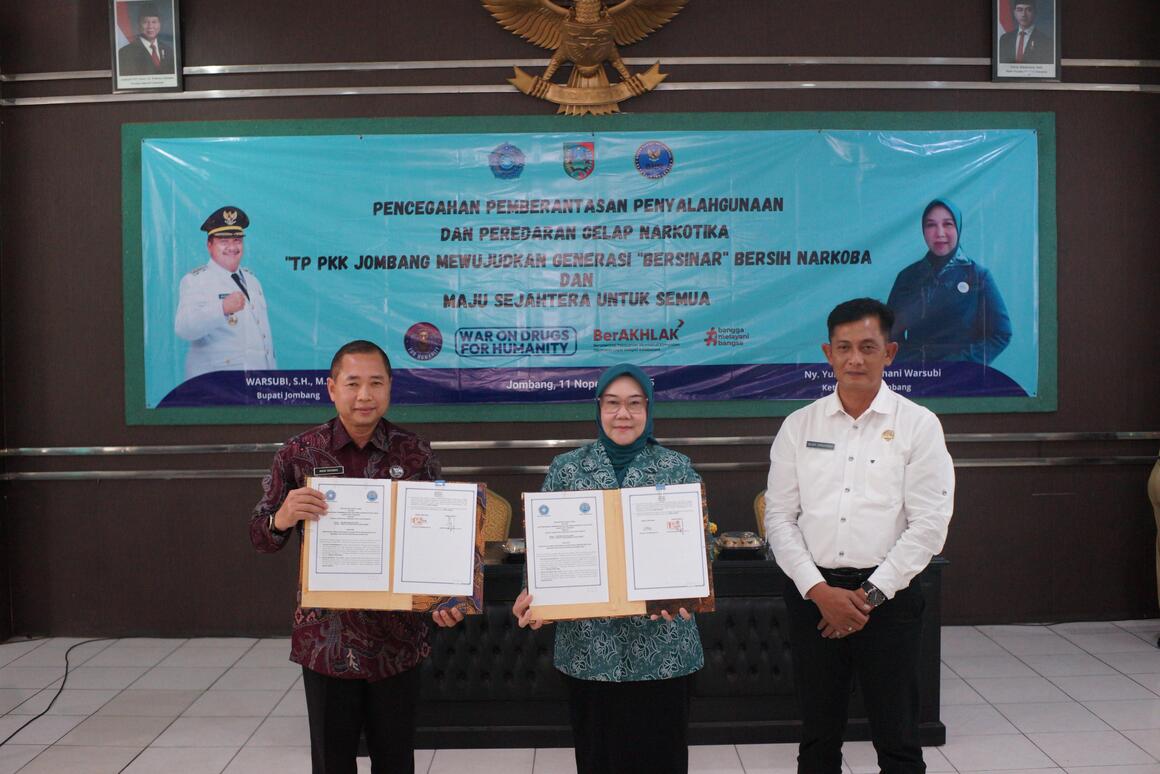 Tak hanya melalui sosialisasi bertajuk “Generasi Bersinar, Bersih Narkoba dan Maju Sejahtera untuk Semua”, hari itu juga ditandai dengan penandatanganan Perjanjian Kerja Sama (PKS) antara TP PKK Kabupaten Jombang dan Badan Narkotika Nasional (BNN) Kota Mojokerto.