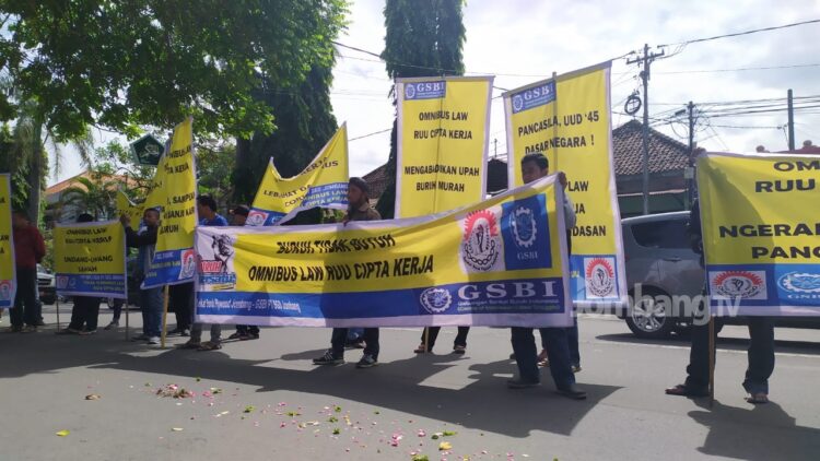 Unjuk rasa dilakukan dengan cara mimbar bebas di depan Gedung DPRD di Jalan Wahid Hasyim. Sembari membawa sejumlah spanduk, buruh juga melakukan orasi mengecam Omnibus Law RUU Cipta Kerja yang bisa mengancam kesejahteraan buruh.